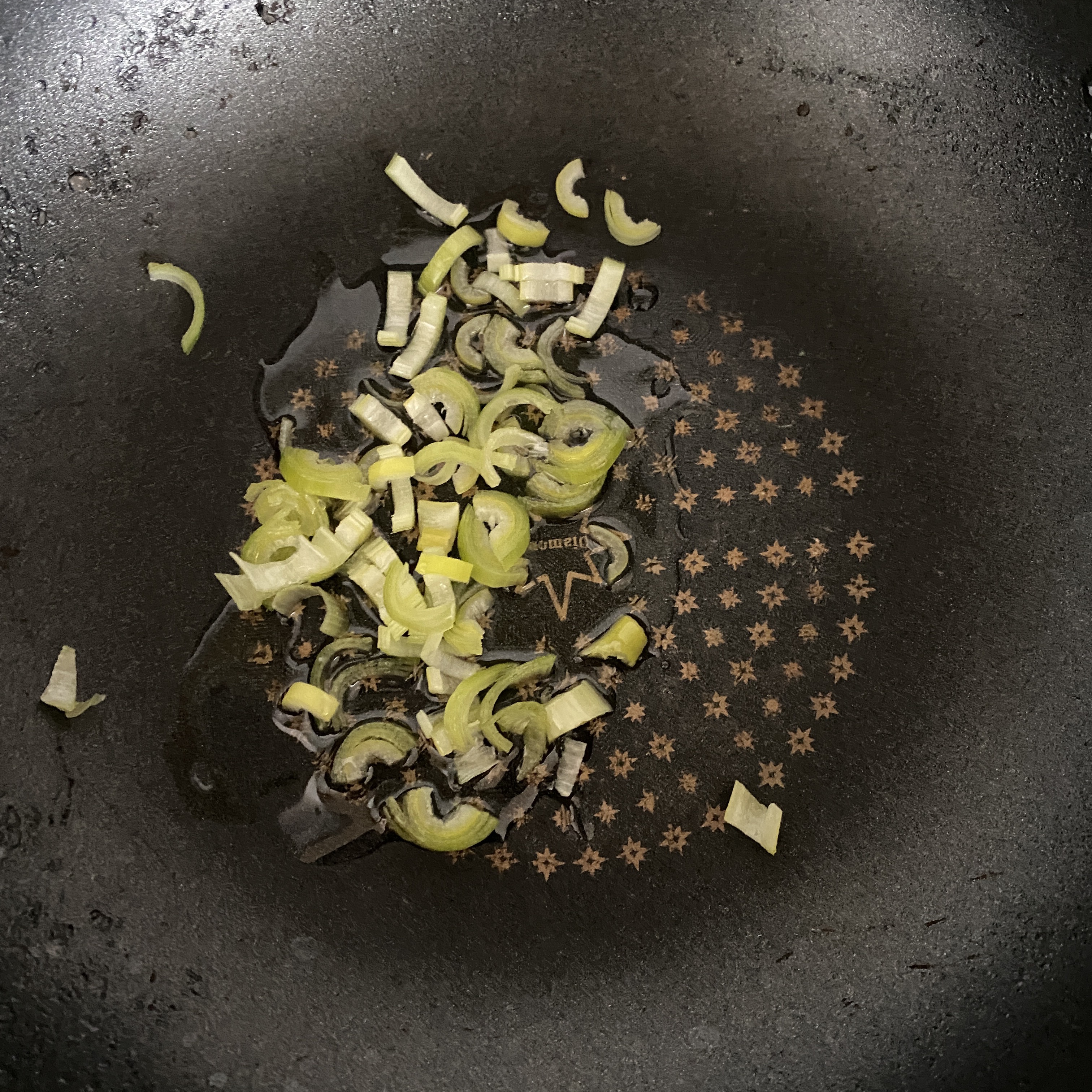 채소 손질 끝냈으면 팬에 파기름을 만들어 준다.