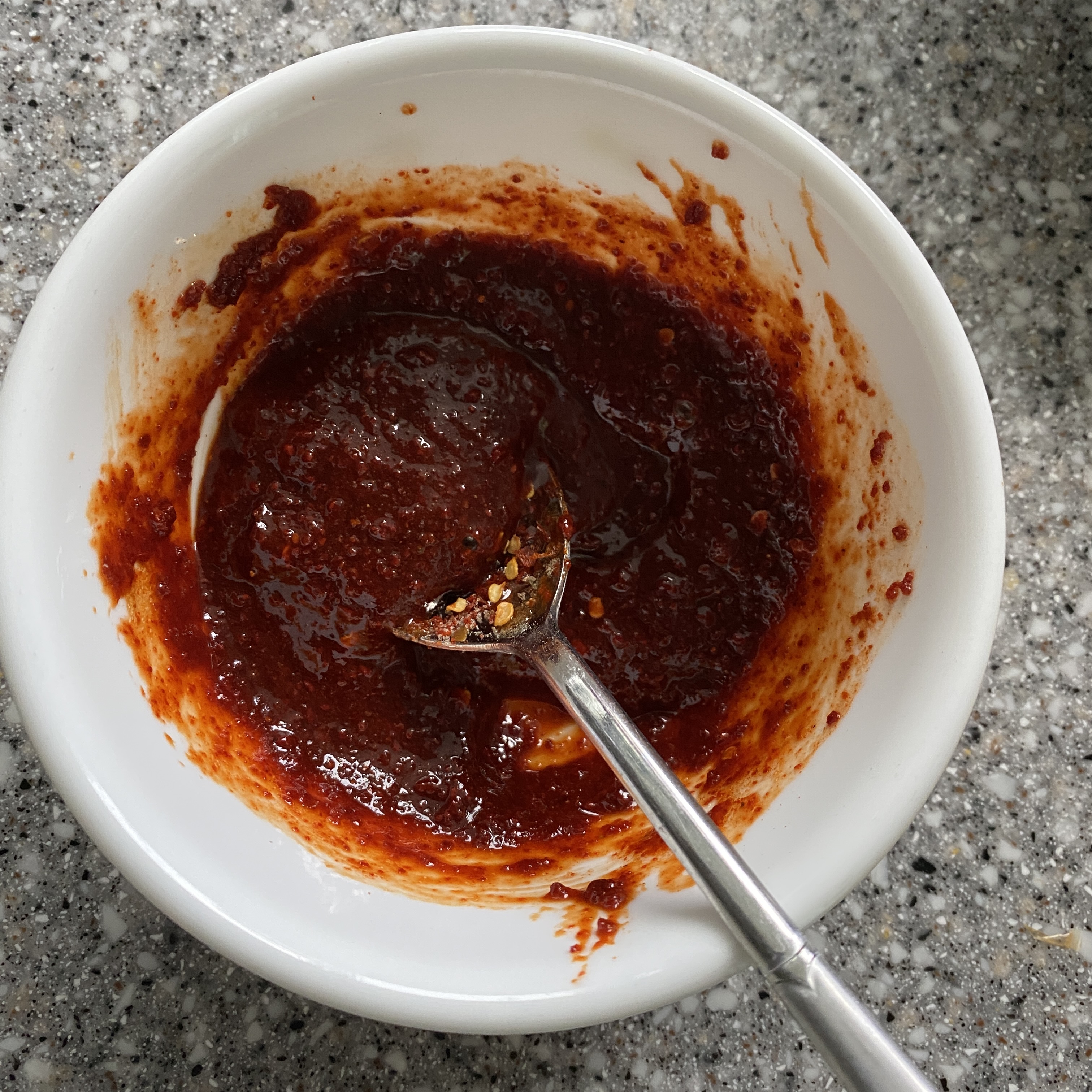 후추가루 2번 톡톡, 페페론치노 3개 잘개 부숴서 물 5스푼 넣고 잘 섞어서 양념장을 만든다.