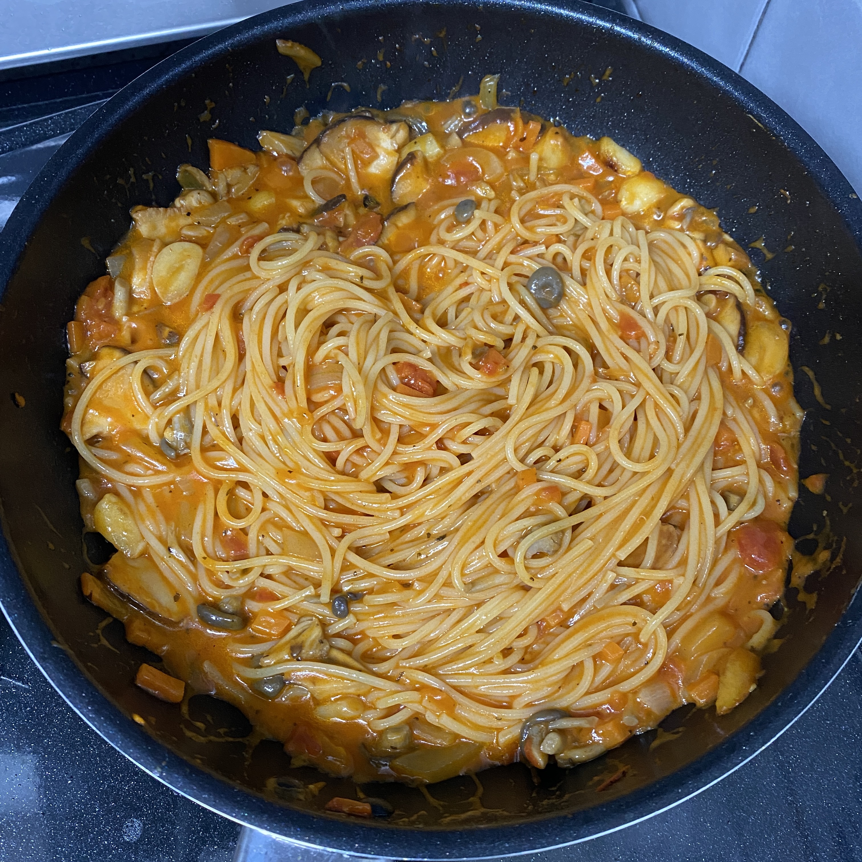 소스를 만들면 7분정도 익힌 파스타면을 넣어주세요.