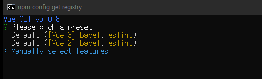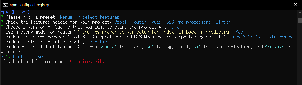 # vue create [프로젝트 명] vue create vue-project이후에 나오는 설정들은 아래와 같이 설정하였다.