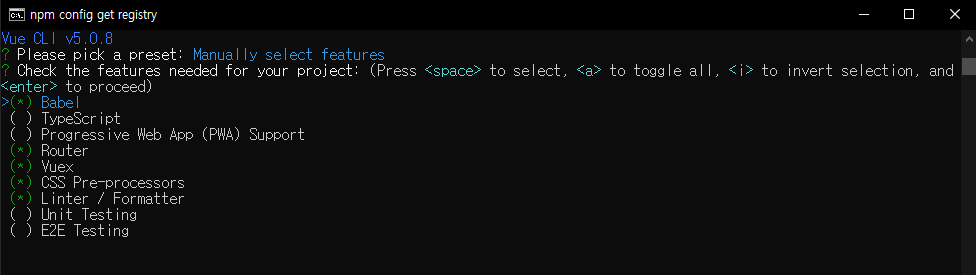 Babel: 자바스크립트 컴파일러(하위 브라우저에서도 동작하도록 변환해줌) TypeScript: TypeScript 지원 Progressive Web App (PWA) Support: PWA 설정 Router: Vue Router 사용 Vuex: Vuex 상태관리 사용 CSS Pre-processors: css 전처리 기능 사용 Linter / Formatter: 자바스크립트 코드 컨벤션 Unit Testing: 단위 테스트 E2E Testing: 통합 테스트